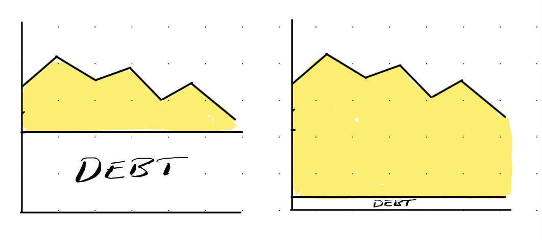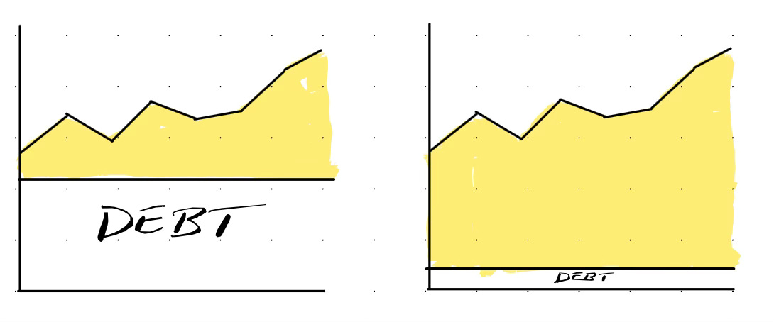 Here are two rough illustrations of a company’s enterprise value over time. The one on the left has a high level of debt (the unshaded portion at the bottom). The company on the right has a lower level of debt.